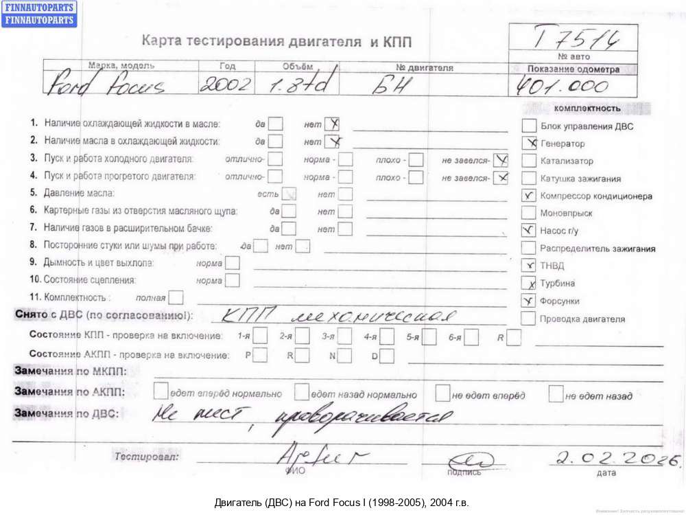| Казань | 2004 | 1321925, 2004, 1.6л, Бензин, Инжектор, FYD.., FYDB4B83221, 1321925, Хэтчбэк 5 дв., зеленый, Фото не актуально, с запчасти отделены: Генератор, Насос гидроусилителя руля (ГУР), FYDB4B83221 | - | С | Т | КК, прокручивается, состояние ГРМ - нормально, поддон -нормально, клапанная крышка - нормально, эмульсия - нет, скол шкива коленвала, сломана ручка щупа, | |||